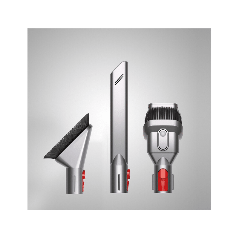 Il est livré avec un accessoire combiné ( brosse et large conduit pour les miettes et les grosses particules)  et un long suceur pour nettoyer les espaces confinés.