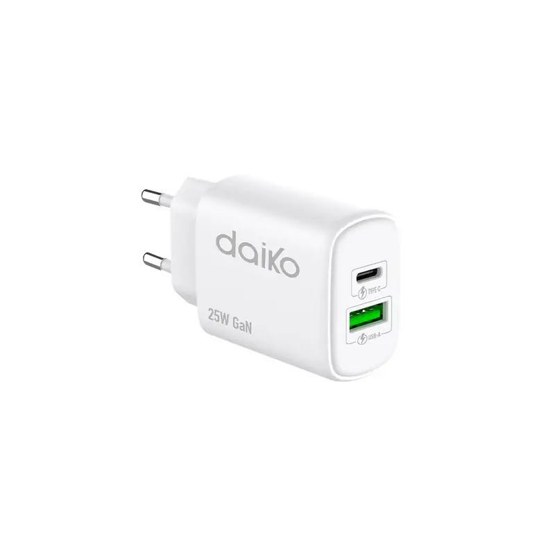 Détails du produit : Fast charger Blanc 2 USB C-A 25W Daiko – FCW-25W2USB